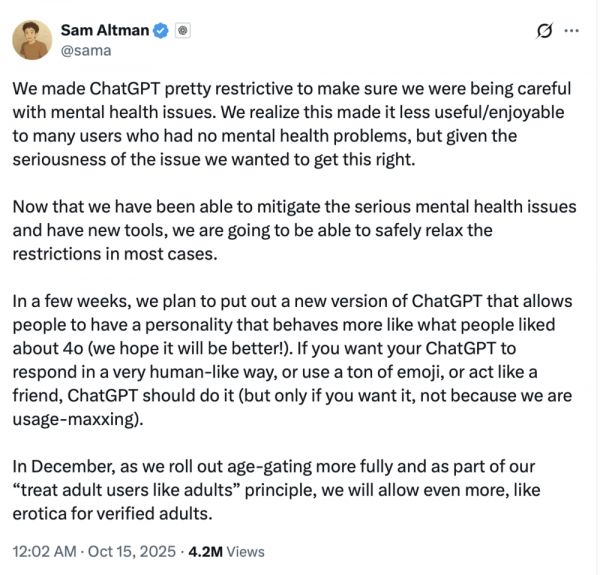 10月15日凌晨,OpenAI CEO奥特曼发文,宣布ChatGPT将在未来几周推出新版本,并计划在今年12月推出更加全面的年龄分级系统,允许为成年用户提供成人内容。