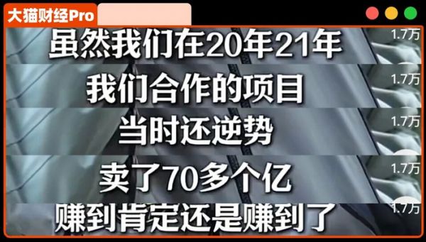 但这只是他自娱自乐的吹牛,整个项目大约20万㎡,按1.5万/㎡来算,满打满算,货值也就是30亿,是咋做到在2年卖了70亿的呢?