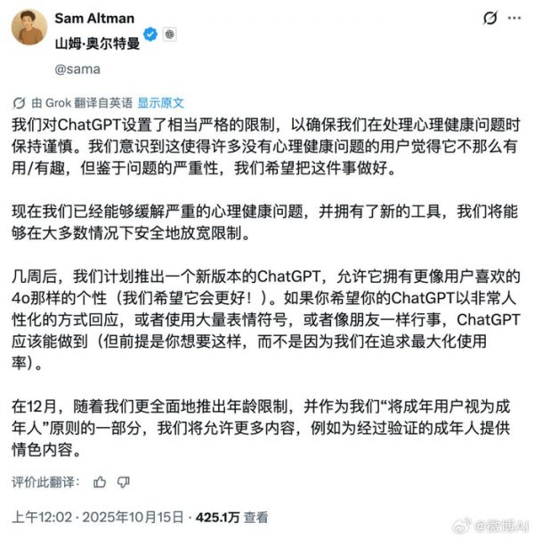 今天凌晨,OpenAI CEO山姆·奥特曼宣布,ChatGPT将上线「成人模式」,允许已验证成年用户访问和生成成人题材内容。官方称此举是出于“用户表达自由”和“AI体验扩展”的考虑,并将配合严格的年龄验证与内容安全机制。