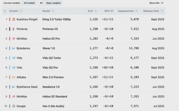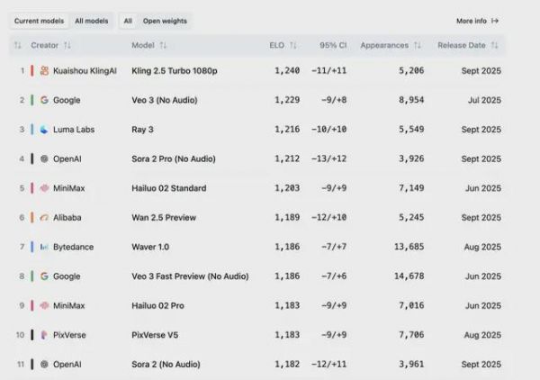 从最新的 Artificial Analysis 榜单可以看到,图片生成视频模型的前十名中,前三全部来自中国——快手可灵、爱诗 PixVerse 和 MiniMax 海螺;而 Sora 仅列第 31 位。OpenAI 最新视频生成模型 Sora 2 在文生视频榜单中排名 11。