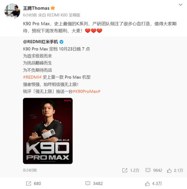 10月17日消息,曾担任REDMI品牌总经理的王腾今天转发了红米手机的官博,同时配文:K90 Pro Max,史上最强的K系列,产研团队倾注了很多心血打造,值得大家期待,预祝下周发布顺利、大麦!