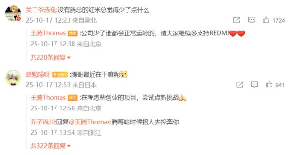 上一次王腾活跃在微博,是他在9月25日通过微博观看了雷军举办2025年度演讲。
