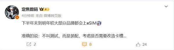 快科技10月18日消息,博主定焦数码表示,从下半年末到明年初,大部分品牌都会上eSIM,这意味着eSIM时代正式到来了。
