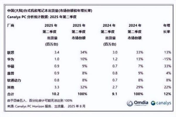2024年华为PC在华出货量同比暴涨35%,2025年第二季度直接冲进中国PC市场前三,把戴尔远远甩在身后。