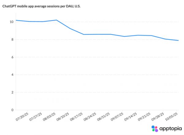 这表明美国用户在ChatGPT应用上花费的时间减少了,每天打开的次数也减少了。