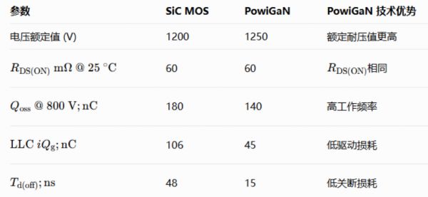 在800V输入侧,英诺赛科氮化镓(GaN)与碳化硅(SiC)相比在每个开关半周期内可降低80%的驱动损耗和50%的开关损耗,从而实现整体功耗降低10%。