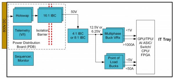 目前,800VDC存在着两种转换架构,一种为三段转换架构(800V→50V→12.5V/6.25V→<1V):800V经16:1 IBC转换为50V(效率98%),再经4:1 IBC转换为12.5V(效率98%),最后通过多相降压稳压器转换为核心电压(效率92%),整体峰值效率约88%。