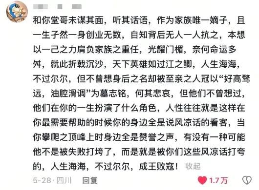 堂哥被大家缅怀,本质就是社会转向期的价值重新定义。大家发现过去普遍高估了自己,低估了社会,把成功想得太理所当然,把赚钱想得太过轻松了。