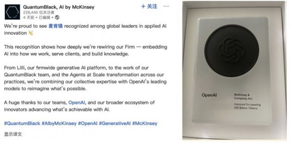 全球顶级咨询公司麦肯锡,居然收到了OpenAI最近给Tokens消耗大客户颁发的奖牌。