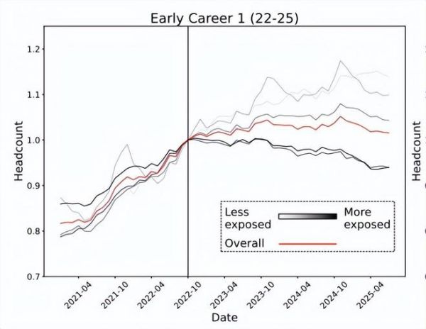 研究显示,AI尤其擅长复制初级岗位所依赖的“书本知识”,这使得22至25岁群体的就业率骤降了13%,成为受AI影响最严重的人群。