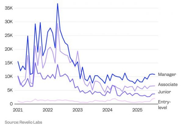 其中受冲击最大的正是入门级职位:今年6月,入门级顾问的招聘数量同比暴跌54%。