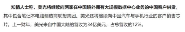 美光在上一财年来自中国大陆的收入约为34亿美元,占其全球总收入的12%。