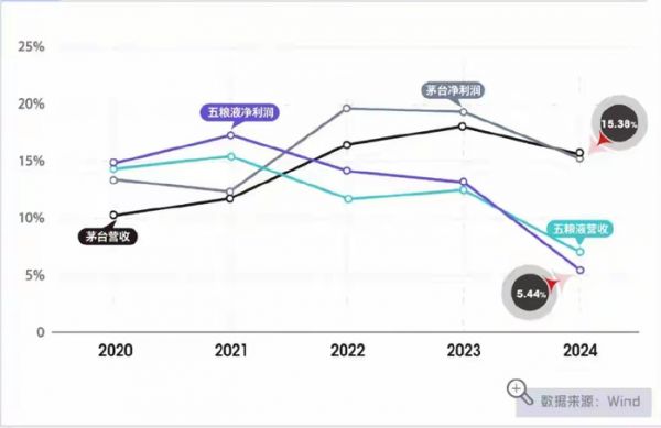 来自Wind的数据显示,近几年两者的营收与净利率增速也呈现明显反差,一路追赶贵州茅台的五粮液,却越来越力不从心了。