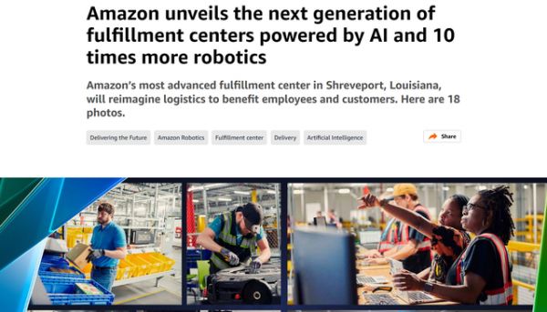 作为自动化的最新成果,亚马逊去年在路易斯安那州什里夫波特开设了其最先进的仓储设施,作为未来机器人配送中心的样板。据介绍,在那座仓库里,一旦商品完成打包,几乎就无需再接触人工。