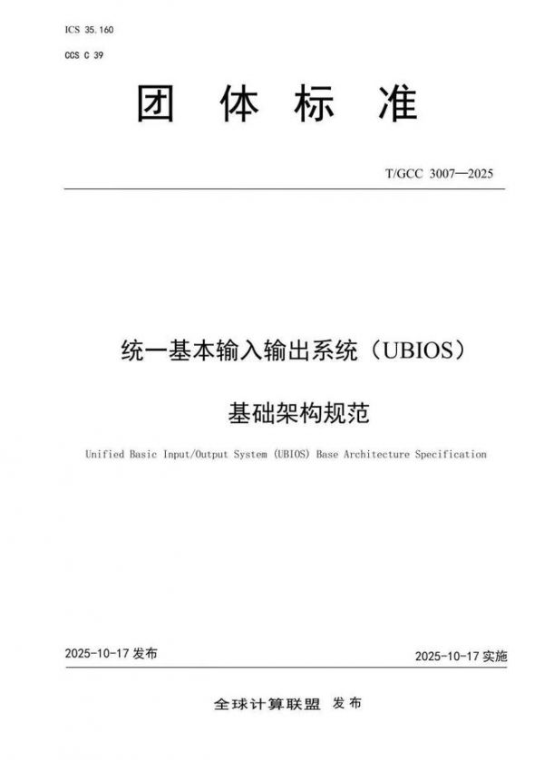 近日,全球计算联盟正式发布、实施《统一基本输入输出系统(UBIOS) 基础架构规范》团体标准,标准号为 T/GCC 3007—2025。