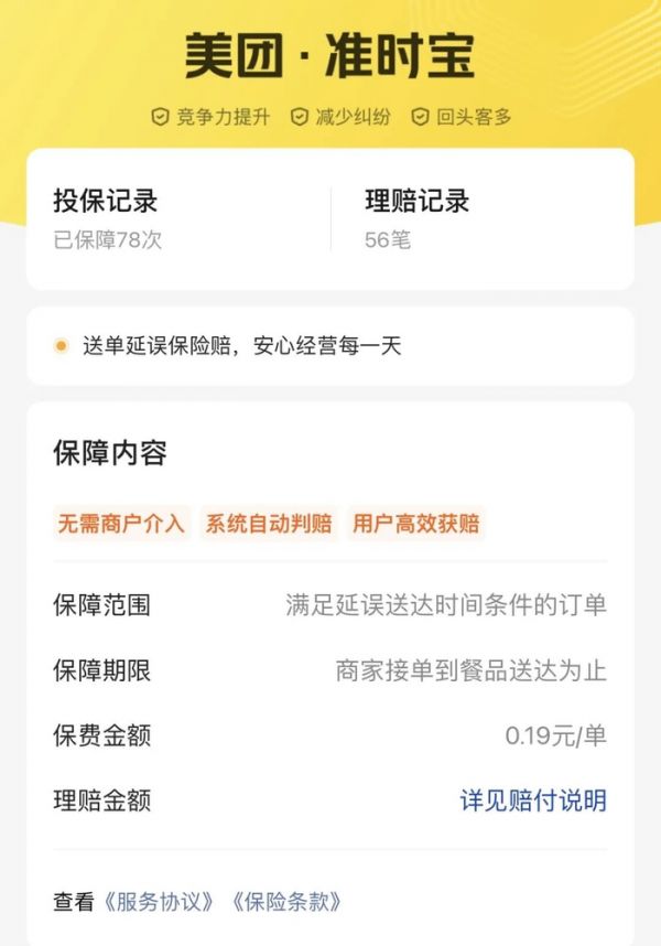 同时,美团是最早建立“超时必赔”体系的平台,在其赔付流程在餐饮外卖业务中迭代多年,已高度系统化,依靠“准时宝”可以做到平台与用户间几乎无人工干预,实现自动赔付。得益于庞大的运力网络和算法调度,美团能精准预测时效风险并即时分配运力。