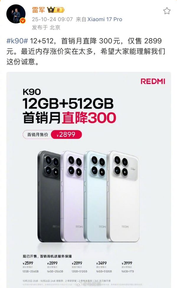 雷军回应红米K90定价,称内存涨价致成本增加