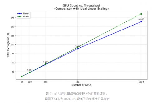 通过上述优化,siiRL框架在沐曦股份超节点集群上实现了从64卡到1024卡的稳定扩展,系统保持了超过92%的高线性度拓展效率。在模型精度上,与国际主流生态 GPU的训练结果相比,沐曦股份超节点集群在验证集上的平均绝对误差控制在0.5%以内,满足实际应用场景的精度要求。