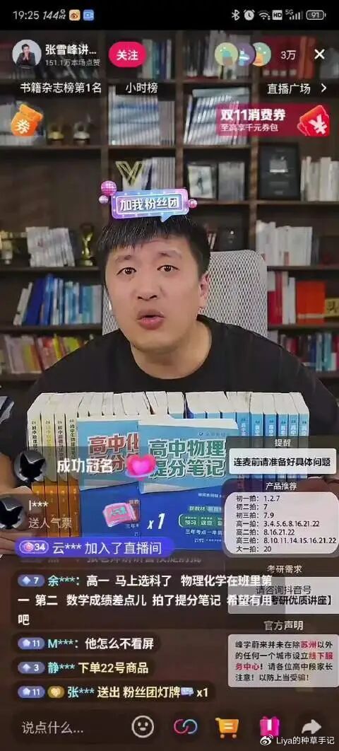 桌上摆着高中提分笔记之类的产品,但有家长问起时,他只让对方录屏了解,反复强调“今天不卖货,只连麦”,还直言“不想第一天回来就因卖货上热搜”。