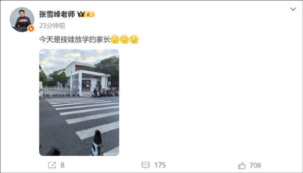 10月22日下午,沉寂28天的张雪峰在微博发了条简单的动态:“今天是接娃放学的家长”,配着校门口的照片。