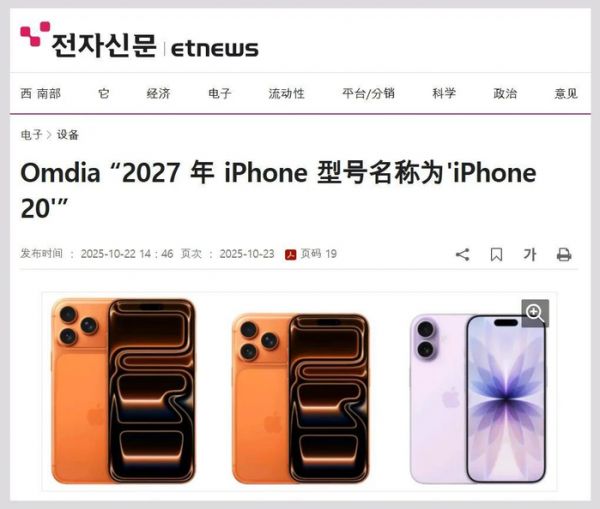 报道中称,据研究公司Omdia首席研究员Heo Moo-yeol透露,2027年苹果将跳过数字“19”,直接以“iPhone 20”作为新机的命名,与二十周年相呼应。