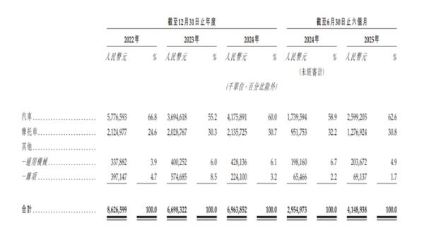 在当前的营收体系中,基本来自汽车和摩托车业务,所谓的新业务还未产生收入。据悉,2022年、2023年、2024年及2025年上半年,千里科技来自汽车和摩托车的收入占总营收的比例分别为90.4%、85.5%、90.7%及93.4%。