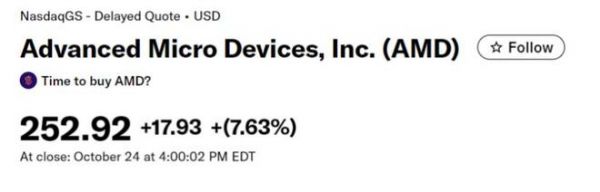 消息一出,引发了全球科技界的广泛关注。在纽约交易时段内,AMD 的市值在当日交易中出现大幅上涨,日涨幅达到约7.6%,市值上涨约290 亿美元(折合人民币 2,000 亿)。而同一时间,IBM 的股票也出现了约 8% 的强劲增长。