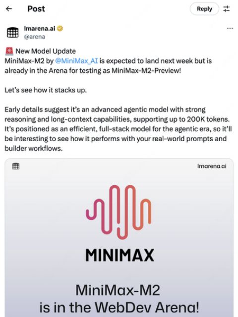 知名科技评测平台LMarena第一时间在社交媒体上向开发者推荐M2模型测试; Reddit社区技术大V在基准测试中运行了MiniMax M2,“它获得了58.3%的分数,这算是相当不错的表现”。