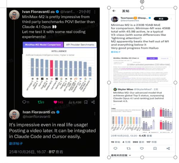 CoreViewHQ联合创始人兼CTO Ivan Fioravant 表示,“MiniMax-M2 的表现相当出色!甚至比 Claude 4.1 Opus 还要好,即使在实际使用中也令人印象深刻”。更有海外个人开发者接入API进行了广泛测试,并在技术社区分享真实案例。