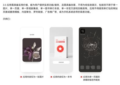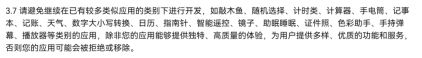 在鸿蒙的《应用审核指南》的“应用功能”章节,明确提出了应用需具备实用价值,能为用户提供实质功能/服务,也不能重复提交严重同质化应用(比如敲木鱼、随机选择、计时类、计算器、手电筒等等)。