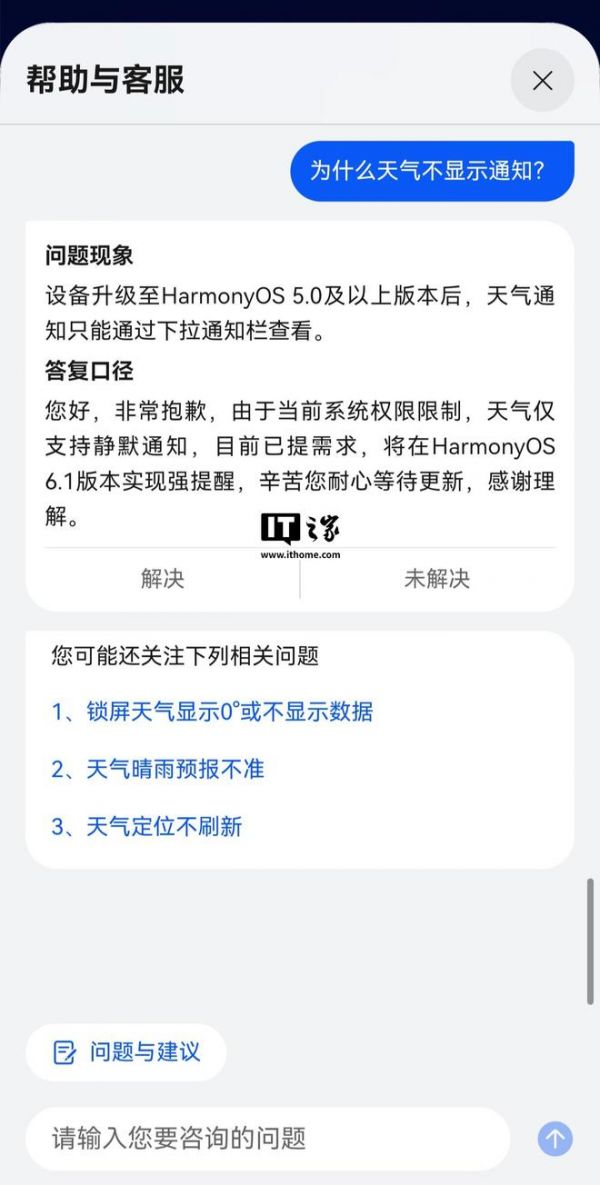 IT之家注意到,目前鸿蒙 HarmonyOS 6.1 版本已露出“冰山一角”,华为天气 App 的“帮助与客服”板块显示,设备升级至 HarmonyOS 5.0 及以上版本后,天气通知只能通过下拉通知栏查看。该问题解决方法如下: