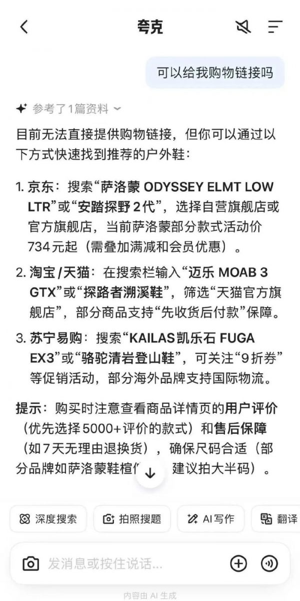 而且从目前体验来看,在夸克对话助手中询问购物问题,还无法直接跳转淘宝天猫,反而提示“可前往京东或苏宁搜索相关商品”——这也暴露了阿里在AI电商闭环上的最后一环,仍待打通。