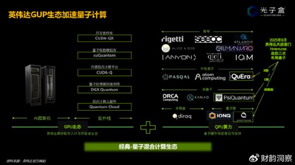 来源:NVQLink值得注意的是,NVQLink的开放性是其核心战略价值。传统上,NVIDIA的NVLink是一种专有技术,主要用于GPU内部连接。但NVQLink采取开放架构,成功汇集了包括17家QPU制造商、5家控制系统制造商和9家美国国家实验室的广泛支持。通过制定这一行业互联标准,NVIDIA的目标不是直接竞争量子硬件,而是确保无论何种QPU技术最终获胜,都必须依赖NVIDIA的GPU和CUDA-Q生态系统进行加速计算和实时控制。这种基础设施赋能者的定位,帮助NVIDIA在未来的量子-AI融合市场中占据了不可或缺的中心地位。