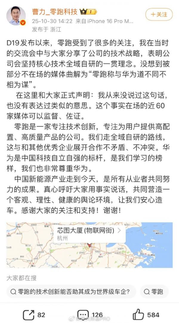 当时,小柴也关注到了这个话题,并总感觉怪怪的,像有人是在刻意引战零跑称与华为道不同不相为谋上热搜!博主:谁在刻意引战……?结果不出所料,这个话题,被刻意制造出来引战的!因为刚刚,零跑高管曹力辟谣称,自己从未说过这句话,在场60多家媒体可以监督佐证!曹力表示,「D19发布以来,零跑受到了很多的关注,我在当时的交流会中与大家分享了公司的技术战略,表明公司会坚持核心技术全域自研的一贯理念。没想到被部分不在场的媒体曲解为“零跑称与华为道不同不相为谋”。「在这里和大家正式声明:我从来没说过这句话,也没有表达过类似的意思。这个事实在场的近60家媒体可以监督、佐证。」