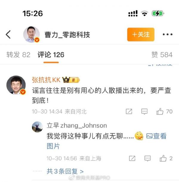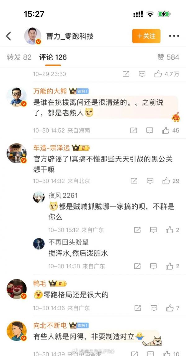 他同时强调,零跑是一家专注技术创新,专注为用户提供高配置、高质量产品的公司。我们走全域自研的路线,这与和其他优秀企业展开合作不矛盾、不冲突。华为是中国科技自立自强的标杆,是我们学习的榜样,我们也非常尊重华为。「中国新能源产业走到今天,是所有从业者共同努力的成果。真心呼吁大家用事实说话,共同营造一个客观、理性、健康的舆论环境,让我们安心造车。感谢大家的关注和支持!谢谢!」曹力说。在曹力的评论区,有博主表示,谣言往往是别有用心的人散播出来的,要严查到底!