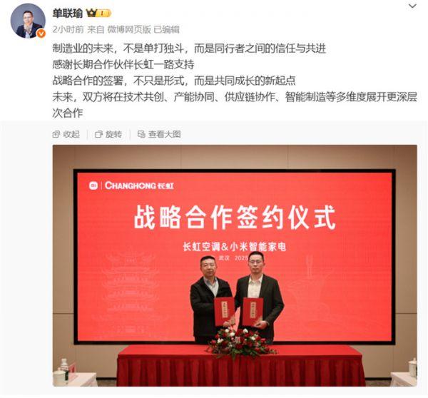 小米集团大家电部总经理单联瑜今日发文,宣布小米智能家电与长虹空调达成战略合作,并且表示制造业的未来不是单打独斗,而是同行者之间的信任与共进。