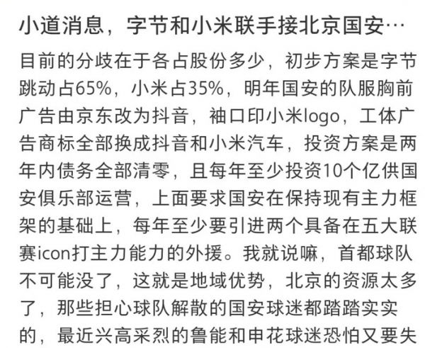 对国安球迷而言,这一消息无疑是一剂强心针。过去几年,俱乐部屡受资金困扰,甚至一度传出解散风险。若字节和小米接盘,球队不仅能够稳定生存,更有望快速重建竞争力。“每年两名五大联赛级别外援”的承诺若能兑现,国安的攻击线或将达到亚冠冠军级别。不过,球迷在兴奋之余也保持谨慎:“传闻太美好,反而让人不敢轻易相信。”