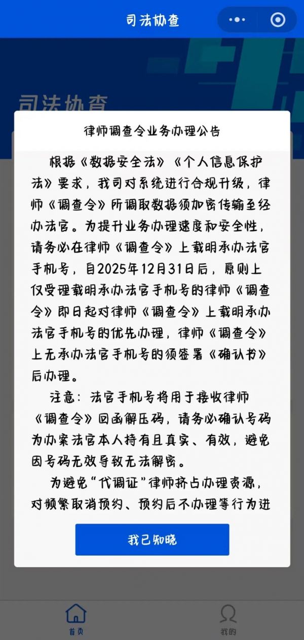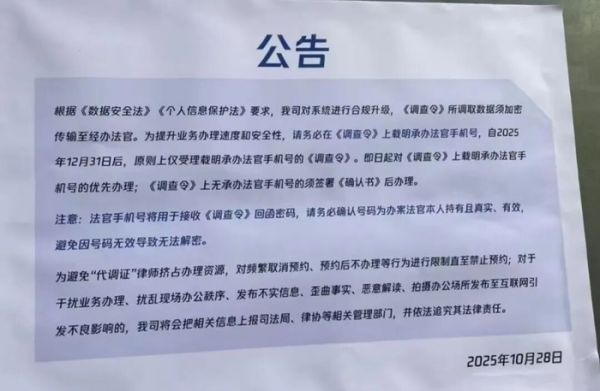 《公告》还称,自2025年12月31日后,原则上仅受理载明承办法官手机号的律师《调查令》。即日起对律师《调查令》上载明承办法官手机号的优先办理,律师《调查令》上无承办法官手机号的须签署《确认书》后办理。
