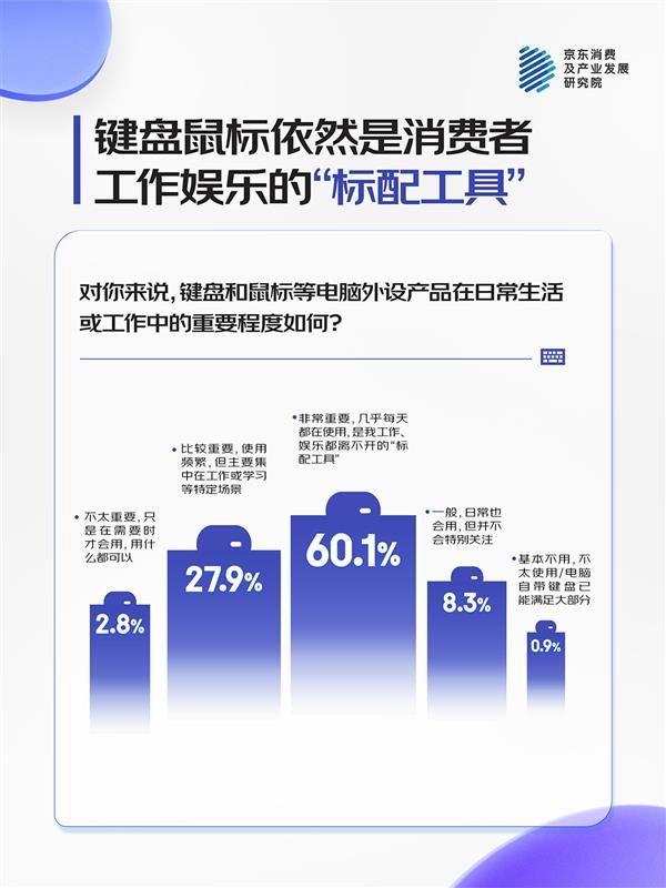 调研显示,键盘鼠标仍旧是消费者认知中的标配工具——近9成消费者将键盘鼠标视为生活必需品,其中,60.1%的受访者认为它非常重要,“是工作、娱乐离不开的标配工具”,近3成人表示其在工作和学习中高频使用。