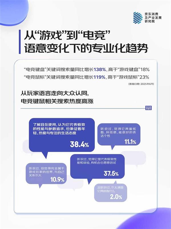 这一语言上的迁移,同样体现在消费者的实际行为中。从京东25年6月的数据表现上,“电竞键盘”与“电竞鼠标”的搜索量同比增幅(138% / 119%),远超传统的“游戏”关键词增速(18% / 23%)。越来越多的消费者主动在搜索框中输入“电竞”,不只是为了找到一款能用的设备,而是为了找到一套能让自己“像玩家一样使用”的装备。这场从语义到行为的变化,正在重塑整个外设市场的叙事方式。