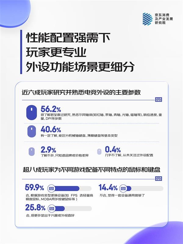 ·游戏玩家引领行业细分,分场景使用不同外设成新常态:59.9%深度玩家会根据游戏类型更换设备,56.2%深入了解轴体、DPI、重量等技术参数,推动外设从通用向专业细分演进,形成“多设备专用化”趋势。