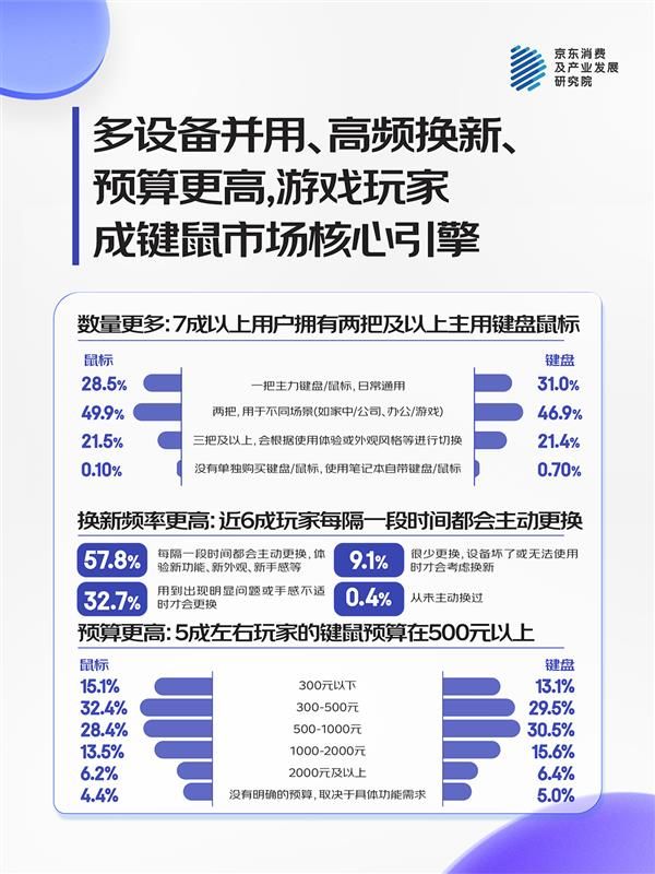 ·游戏玩家为键鼠主力消费人群,他们“设备更多” “换新更高频””预算更高”。 调研显示,7成以上用户拥有两把及以上主用键盘鼠标,近6成游戏玩家表示“每隔一段时间都会主动更换,体验新功能、新外观、新手感“,近5成玩家的键鼠预算集中在500元以上中高端价位。