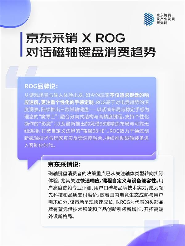 京东采销指出,磁轴键盘消费者的决策重点已从关注轴体类型转向实际体验,尤其关注快速响应、键程自定义与设备兼容性。用户高度依赖专业评测、用户口碑与品牌技术实力,愿为领先科技和品质支付溢价。随着国内电竞生态成熟与用户需求细分,该市场呈现快速成长,以ROG为代表的头部品牌有望凭借技术积淀和产品创新引领新增长,开拓高端外设新格局。