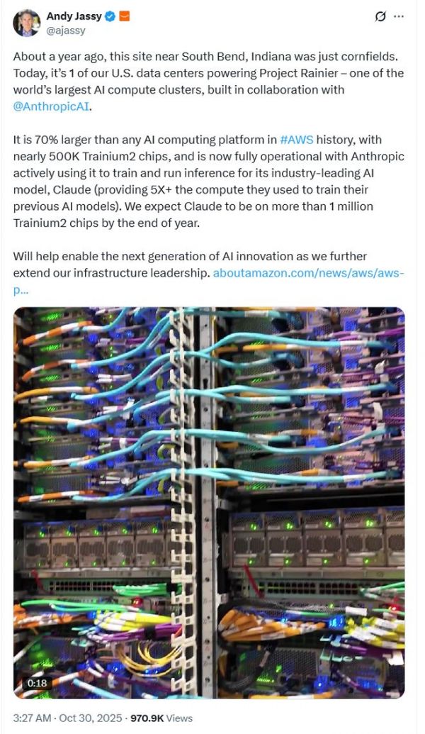 Project Rainier系统的正式投运标志着AWS大规模AI产能扩张的开始。