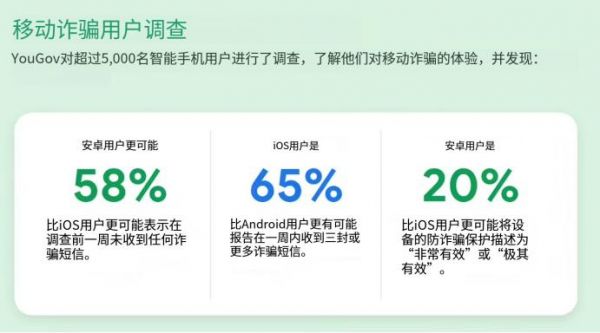 具体来看,调查前一周内未收到任何诈骗短信的安卓用户,比iOS用户多58%;iOS用户报告每周收到三条及以上诈骗短信的可能性,比安卓用户高65%。