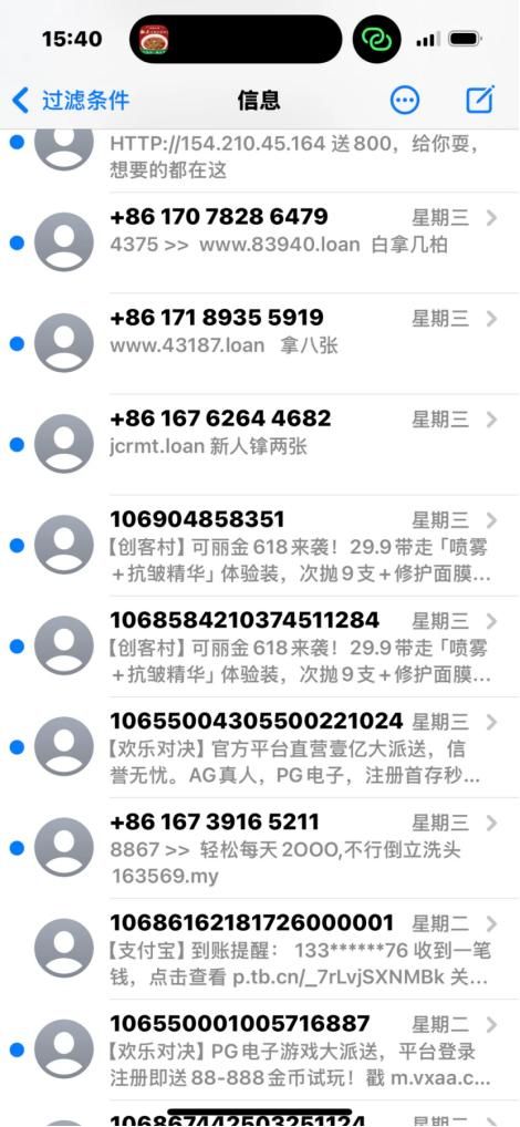 科小编上一部手机是iPhone14,每天总要收到十几条,收到的诈骗短信和上面这些用户差不多,没法一键屏蔽,只能一个个拉黑。