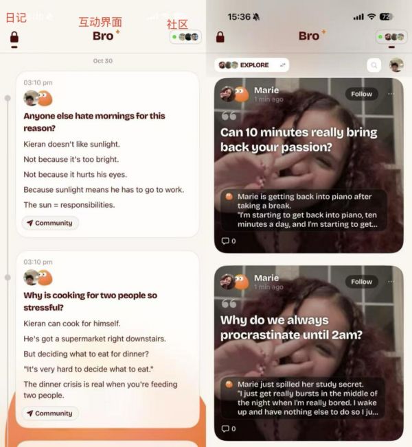 最后,无论是基础的文字语音交互还是基于录屏的交互结束后,Bro 会通过日记的方式将用户提到的关键信息记录下来,形成一个简短的日记(感觉产品也是以这样的方式做自己的记忆库来方便调取历史信息),用户可以随时在主页右划访问这些日记,还可以选择将日记发布到 App 中的社区版块,供其他用户浏览(如右图),算是加入了一点人与人社交的功能,但是感觉聊胜于无。