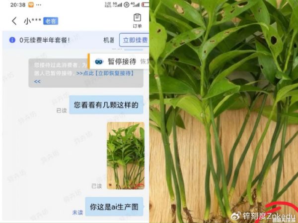 “真是没想到还有这种操作。”90后宁珂今年在电商平台开了一家网店,主要做绿植种苗批发。最近,店里一位老客申请退款,发来的图片里,种苗叶片上有不少大小不一的虫洞。乍一看,宁珂立即向对方道歉并询问“有几颗是这样的?”,但仔细一看,她才发觉不对劲,“右下角还留着水印:豆包AI生成。”