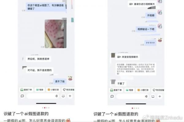 其中,一位售卖美妆产品的商家在小红书上发布“识破了一个AI假图退款”的笔记,根据其发布的对话截图,消费者给她发来了自己使用产品后脸部过敏的图片,图片上的人面部出现大面积的红疹。但当商家提出进行视频聊天以便确认情况时,对方挂断视频聊天并表示“不要了”。后来,商家指出,“你这个明显是AI假图了,涉嫌造假了。”对方才道歉并表示,“我不是故意的。”