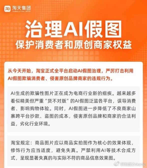 事实上,国家网信办等4部门联合发布的《人工智能生成合成内容标识办法》已正式实施。“标识办法”明确所有AI生成的文字、图片、视频等内容都要“亮明身份”。而淘天集团则早在今年3月发布公告,表示要“治理AI假图,保护消费者和原创商家权益”。该公告提到,“商品图片应以商品实拍图作为核心的效果体现,修饰行为应当适度,避免失真。严禁利用AI等技术合成方式,呈现显著失真的与实际不符的商品信息效果图。”